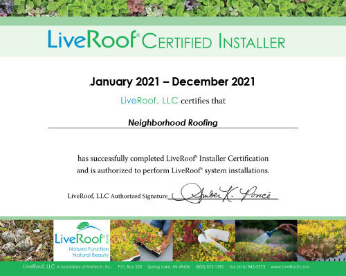 Neighborhood Roofing Co. is proud to be Ann Arbor’s Certified LiveRoof Installer. Through the LiveRoof program, we install Hybrid Green Roof Systems. Green roofs go beyond any other roofing option when it comes to the multitude of benefits they provide to those who own, work, and live under them. Green roofs are beautiful, create a safe habitat, promote health and well-being, reduce stormwater runoff, protect building envelopes, and conserve energy.
