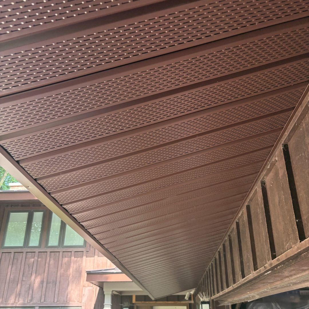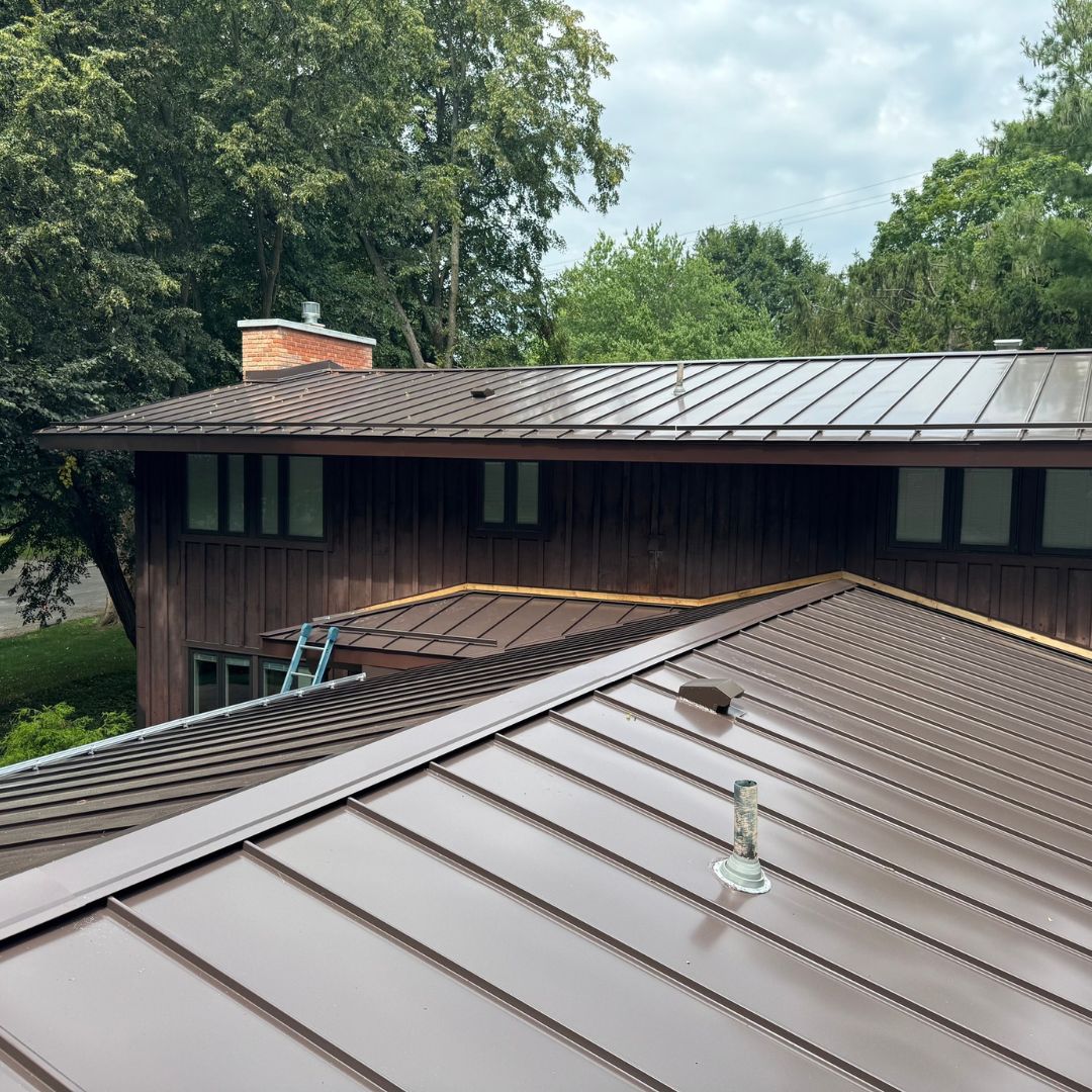 Check out this stunning seamless brown metal roof we installed on a brown-toned home—perfectly blending durability with style. To complete the look, we added matching soffits and fascia, creating a clean, cohesive exterior. From custom-fabricated trim to perfectly rolled panels, every detail is engineered for strength, longevity, and unmatched aesthetics.At Neighborhood Roofing we make sure your metal roof is safe in all the elements including winter with heavy snowfall by using Ace clamp snow retention.