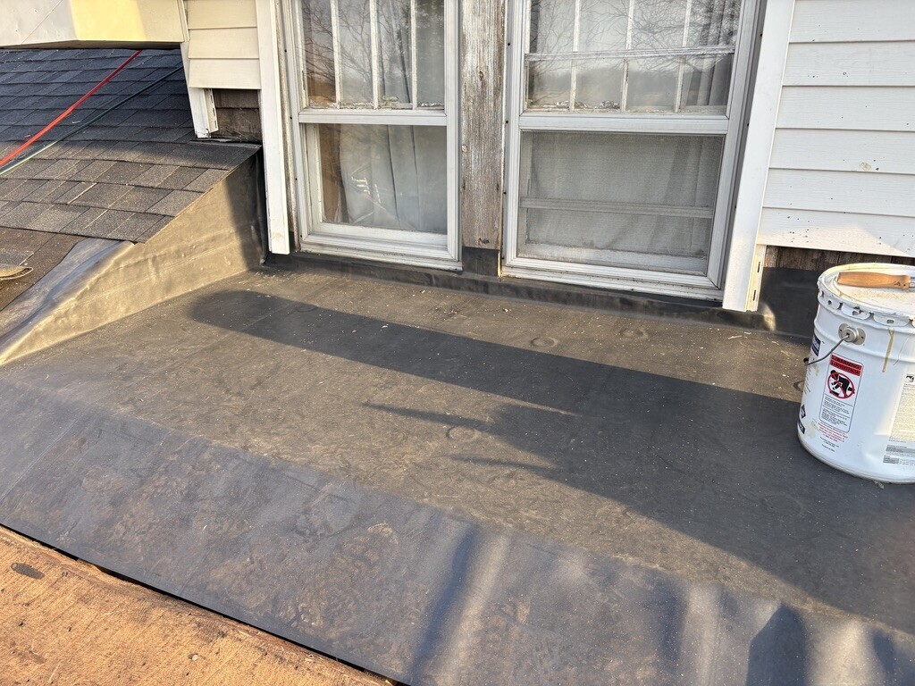 This farmhouse also had a low-slope roof section, which required a different roofing system than standard shingles. For that area, we installed a new EPDM rubber membrane roof.